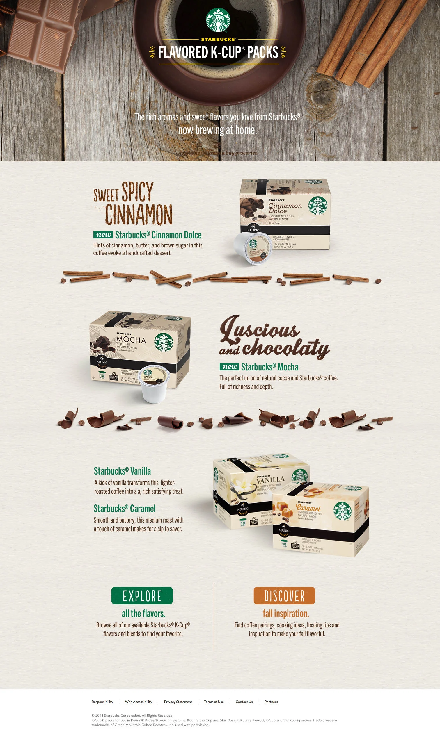 Brand Statement: The rich aromas and sweet flavors you love from Starbucks®, now brewing at home. Introducing two new K-Cup® flavors for fall, inspired by our café favorites.