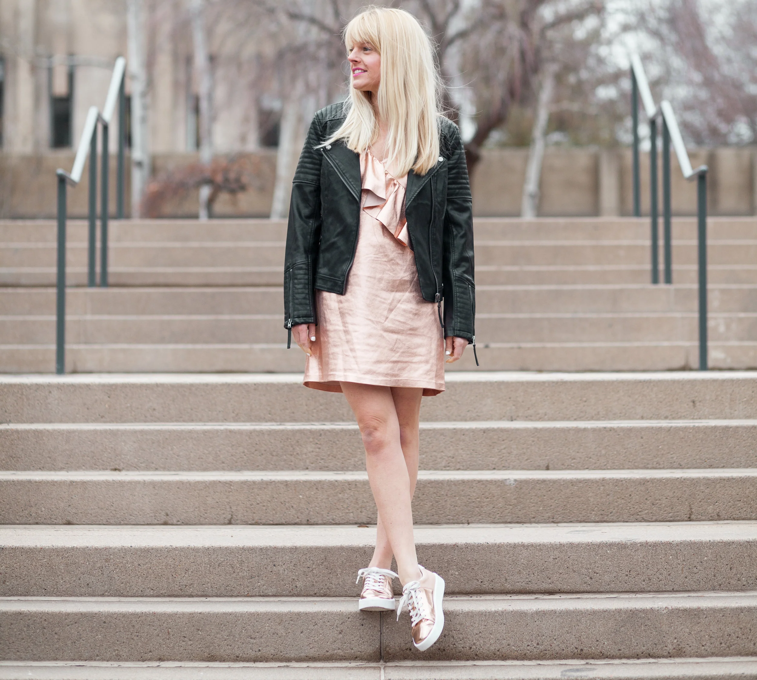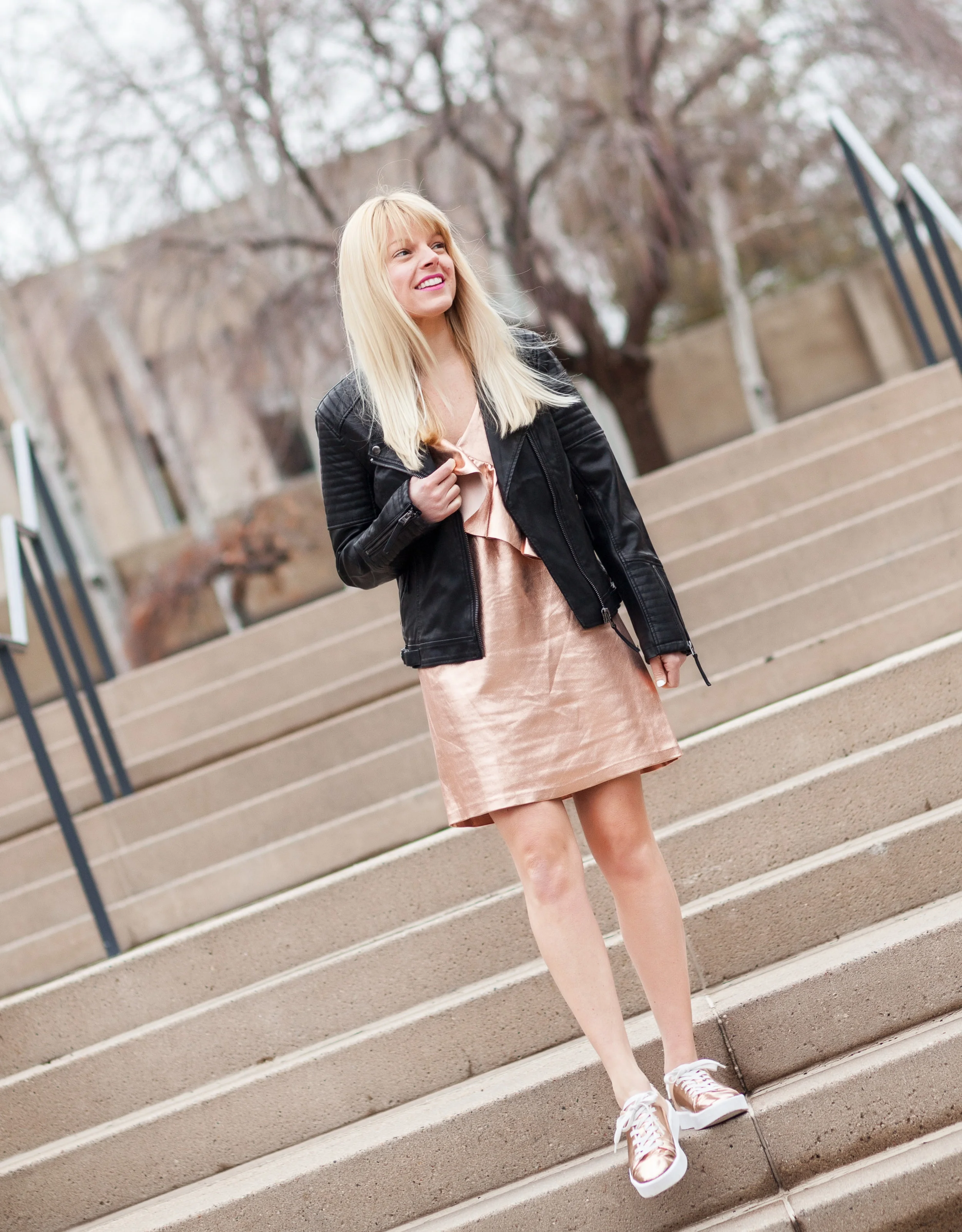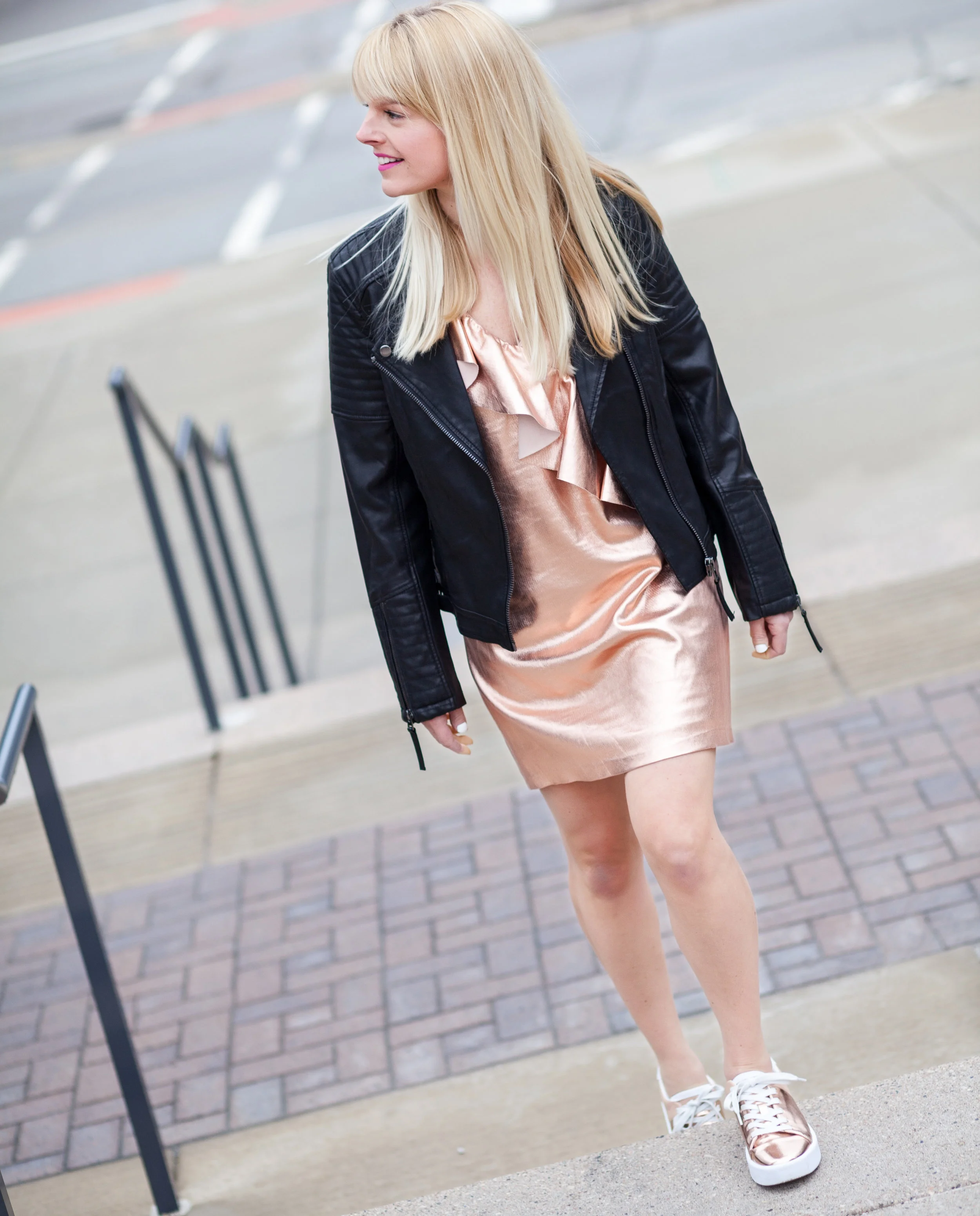 As for today, I might literally match the color of my dress but I couldn't resist not sharing this spicy little number that looks equally great with tights and heels for your next date night. The best part - it's $24 and made really well. It's a faux leather dress. I can't wait to wear it for Valentine's Day with the hubby.
