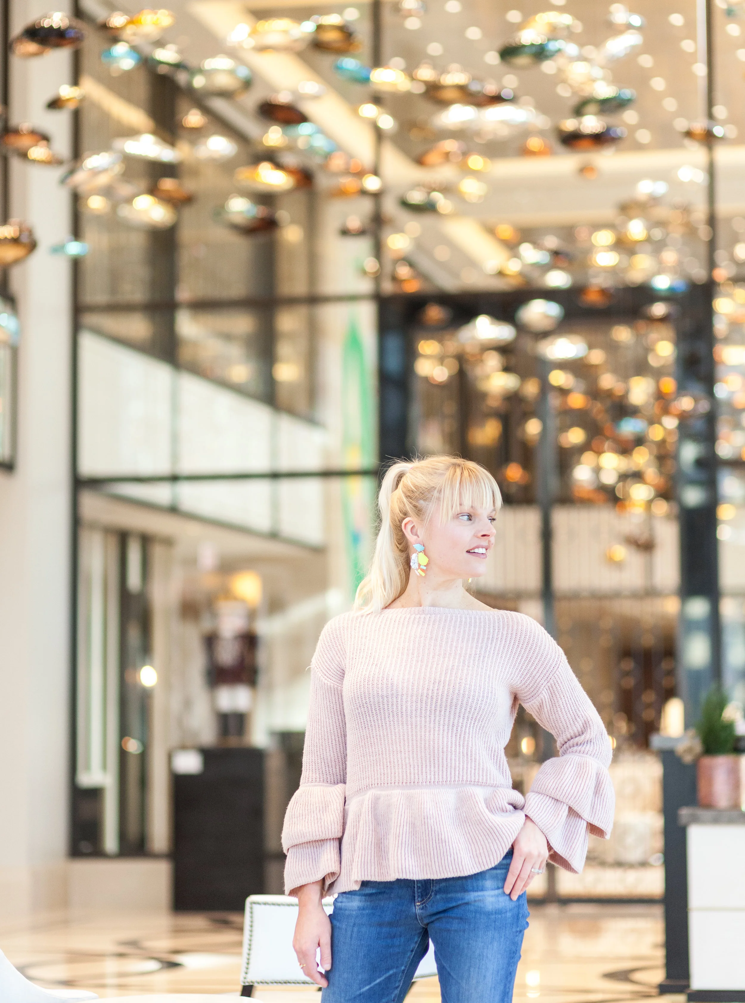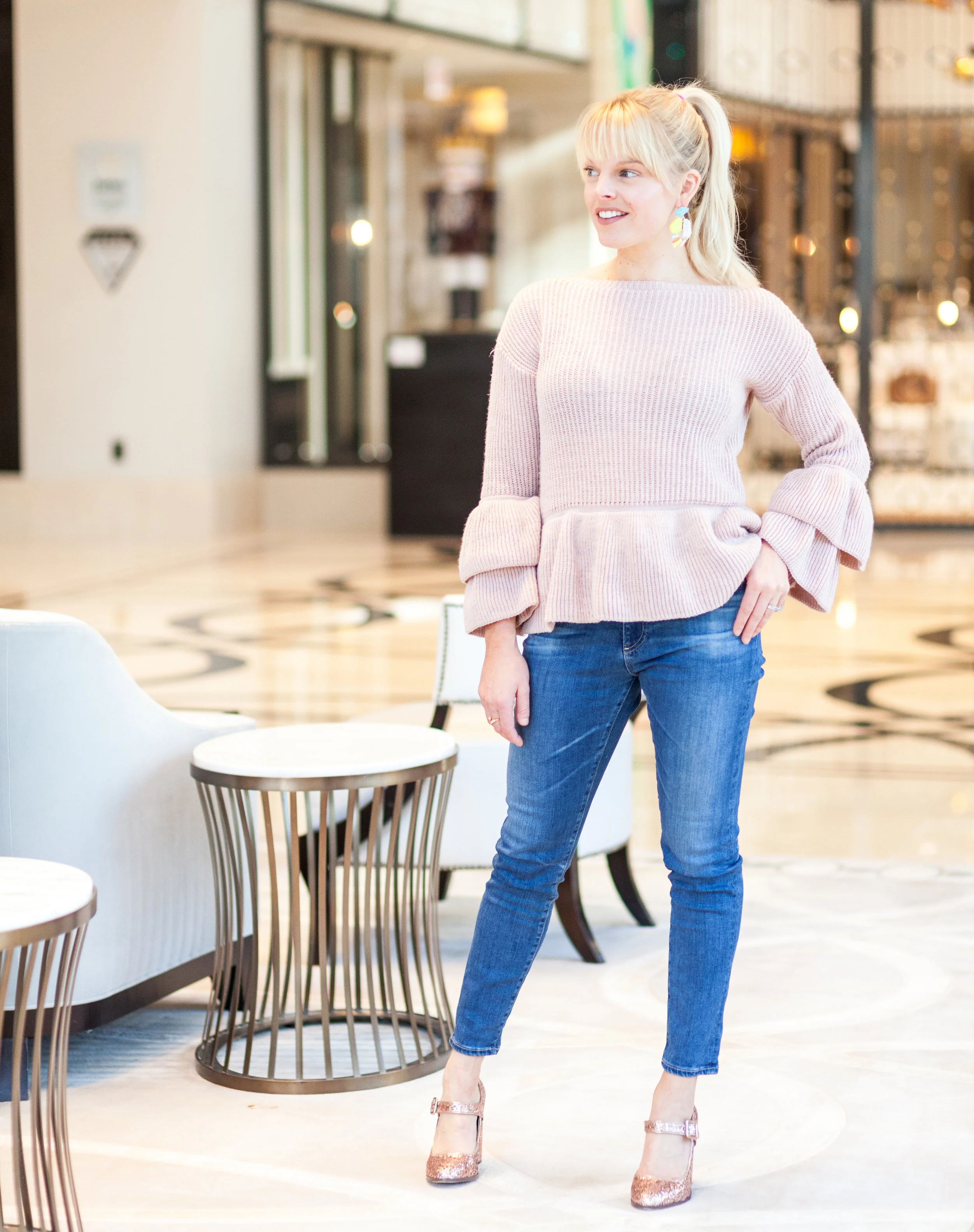 Finally, this blush sweater. Under $40 and a great basic. I love the ruffled bell sleeves and you know I adore all things pink!